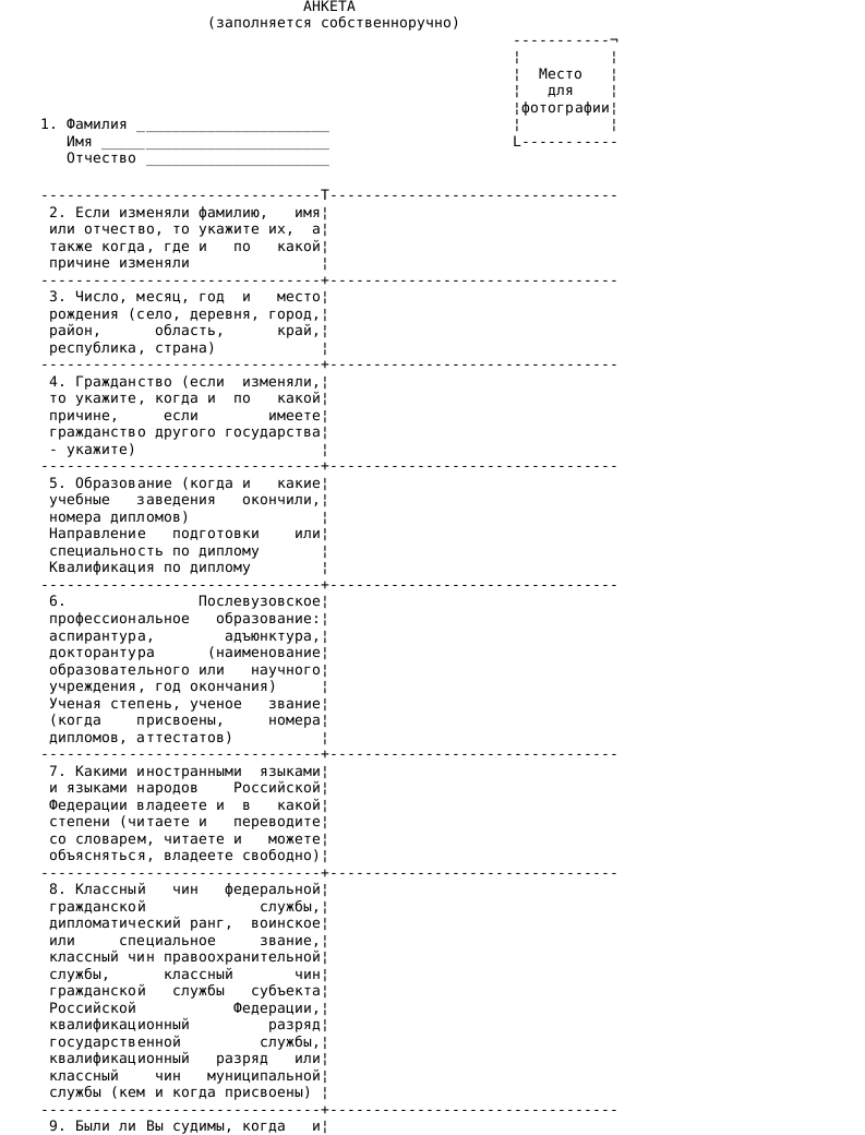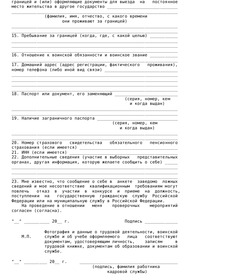 Бланк анкеты, подлежащей представлению в государственный орган гражданином
