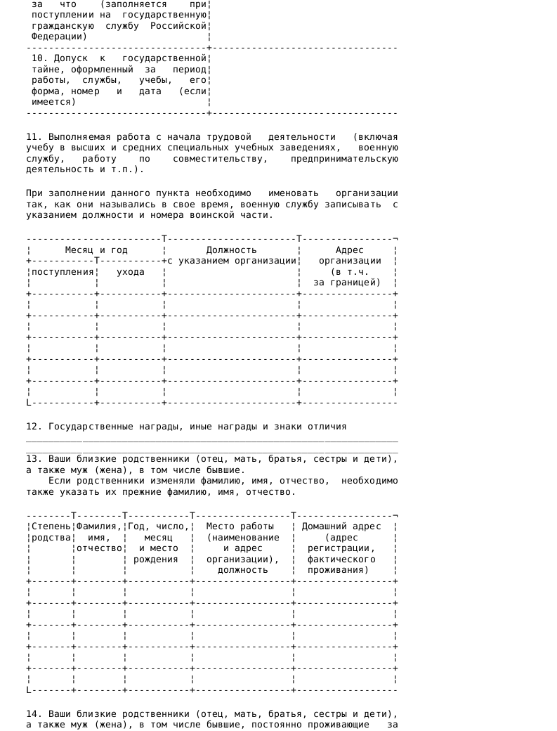 Шаблон анкеты, подлежащей представлению в государственный орган гражданином в графе 11 содержит информацию о предыдущих местах работы. Указывается наименовании организаций и период выполнения должностных обязанностей. Кандидат, устраивающийся на работу впервые, ставит отметку «ранее не работал», Информация о близких родственниках отражается максимально полно. Если у гражданина нет доступа к сведениям о том или ином человеке, стоит поставить отметку «Информацию об этом человеке не имею».