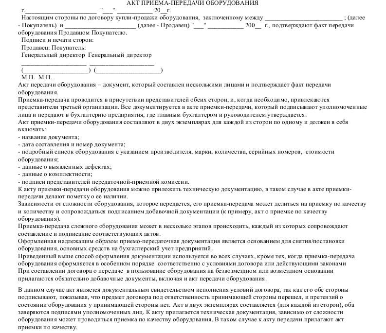 В данном случае акт является документальным свидетельством исполнения условий договора, так как его обе стороны подписывают, показывая, что предмет договора под ответственность принимающей стороны перешел, и претензий о состоянии оборудования у принимающей стороны нет. Акт в двух экземплярах составляется (для каждой из сторон), оба заверяются подписями уполномоченных лиц. К акту прилагается техническая документация, зависимо от сложности оборудования может проводиться приемка по качеству оборудования. В таком случае к акту передачи прилагают акт приемки по качеству.
