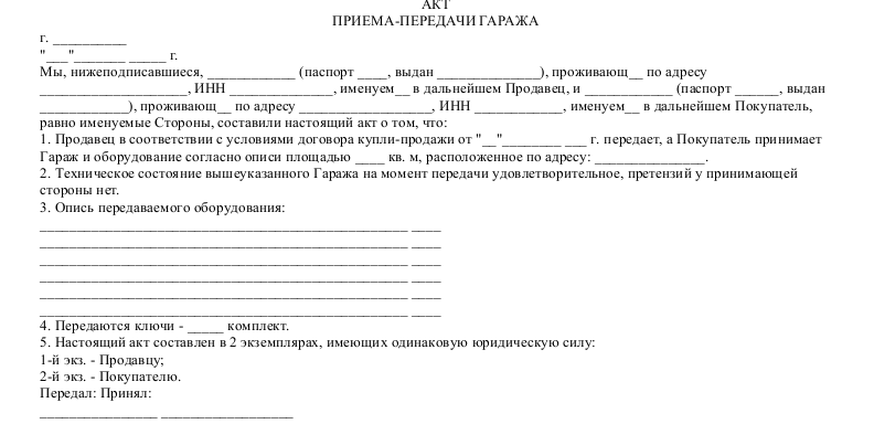 Форму акта-приема гаража основывают на акте приема-передачи недвижимости.