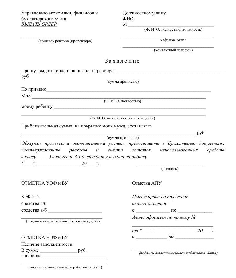 отметку, удостоверяющую, что документ соответствует всем стандартам и подходит для заверения его подписью или печатью. Когда документ полностью готов, его заверяет главных бухгалтер. В него могут внести дополнительные сведения об остатке не потраченных средств или другие важные подробности, которые могут оказать влияние на оплату труда служащего. Работник, который имеет долг по ранее взятому, но не погашенному авансу, не может рассчитывать на то, что руководство пойдет ему на встречу в решении данного вопроса. Также, в согласии с нормами и законодательством, сторона получившая аванс не имеет право передавать его другому лицу.