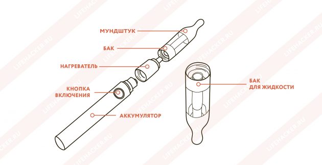 - курильщик вдыхает не дым, а пар. Он может содержать никотин или ароматные добавки