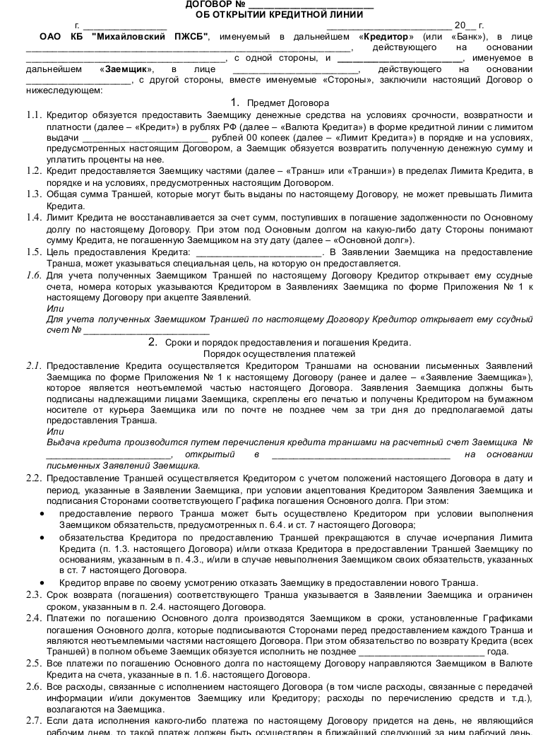 Скачать образец договора о предоставлении кредитной линии в формате .doc