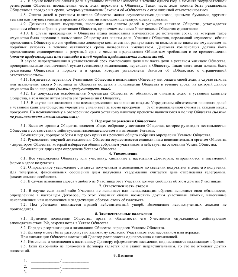 Договор предусматривает размер уставного капитала Общества, порядок проведения учредителями совместной деятельности по учреждению Общества, размер в уставном капитале общества их долей и другие условия, которые установлены законодательством об ООО.