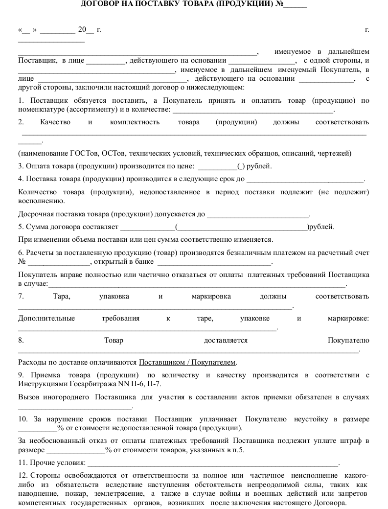 Образец договора поставки товара (купли – продажи)