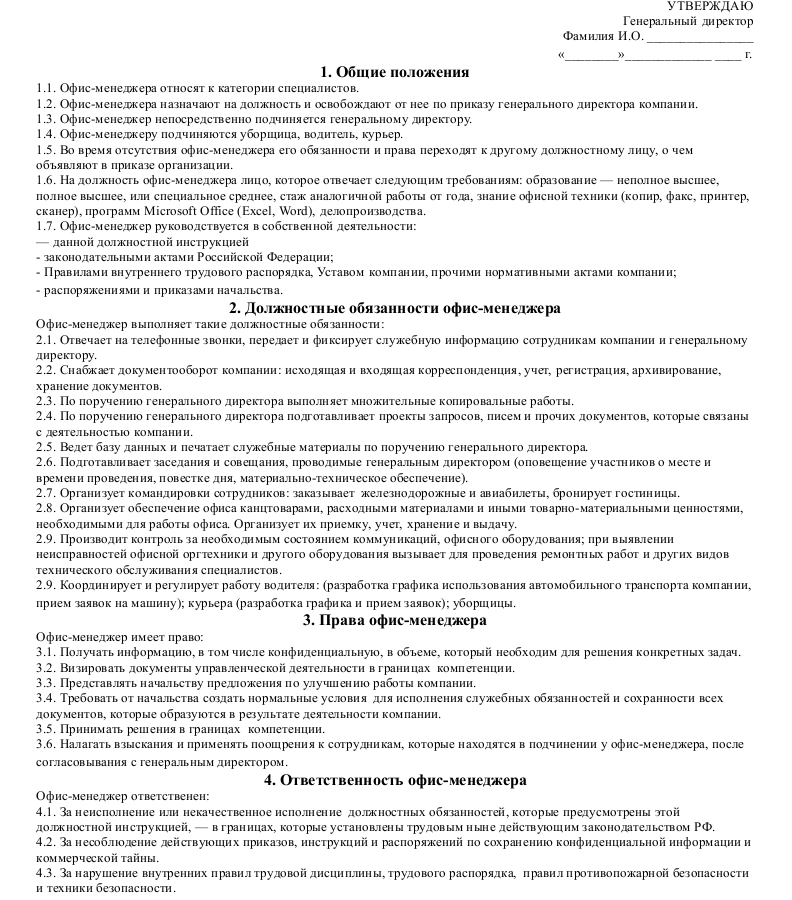 К сожалению, в законодательстве не существует единых правил для составления данного производственного документа. Однако существует один общепринятый шаблон – должностной инструкции офис-менеджера он тоже касается.