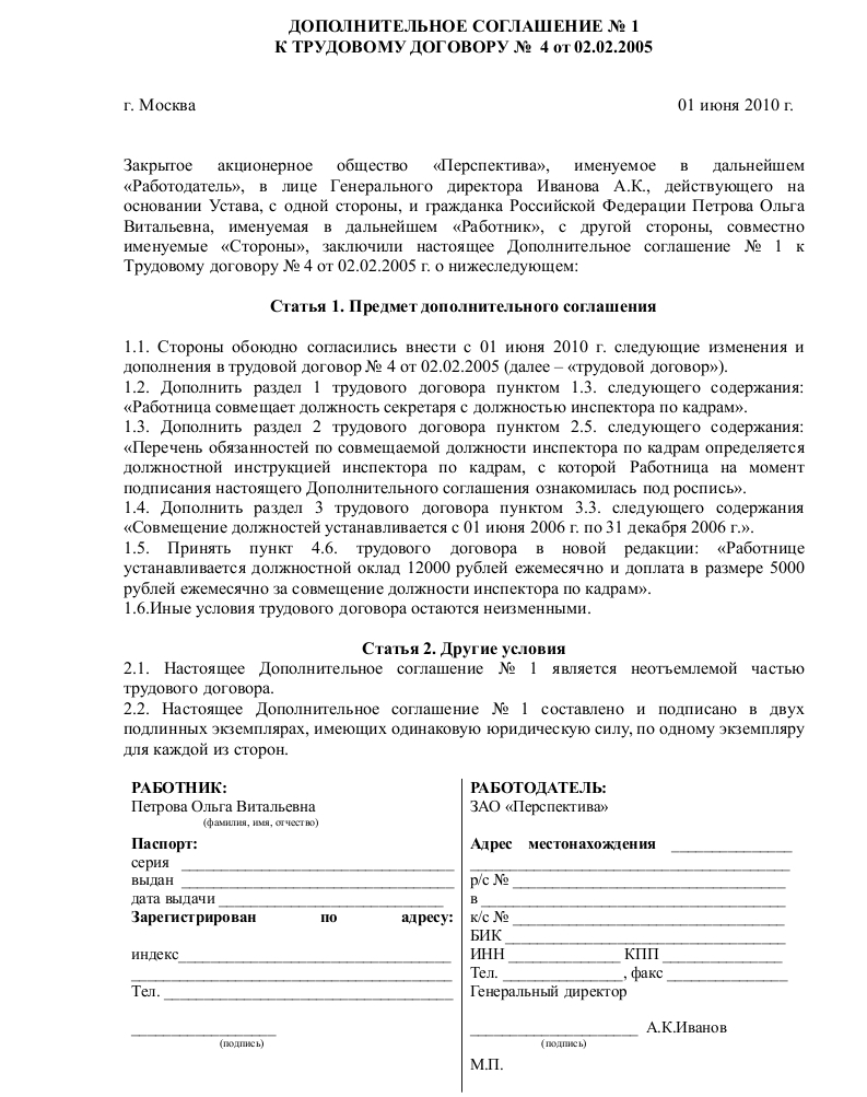 Образец дополнительного соглашения на совмещение должностей