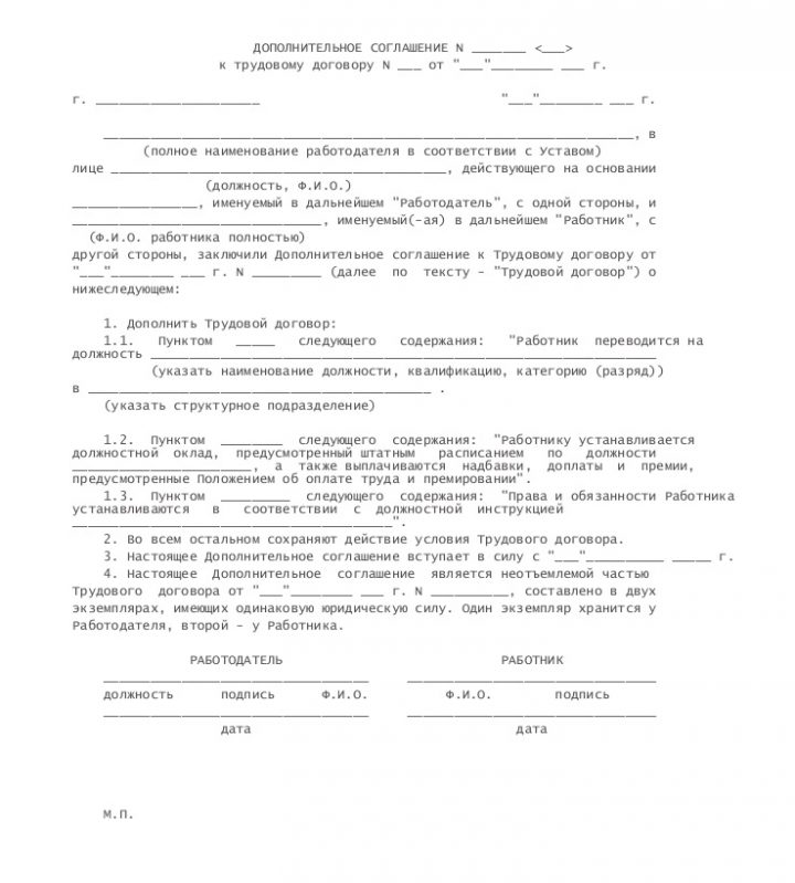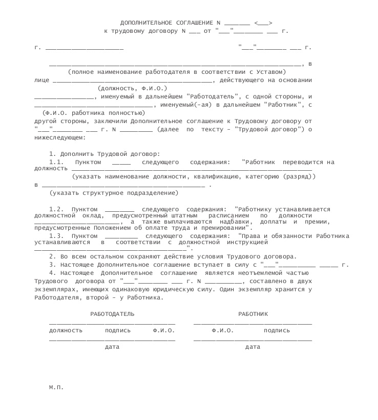 Образец дополнительного соглашения о переводе сотрудника на другую должность