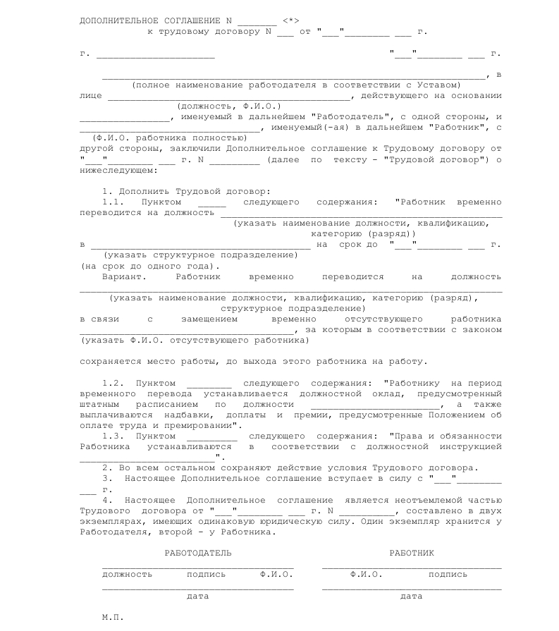 Дополнительное соглашение для непостоянного перевода необходимо заполнить в двух копиях, чтобы по одному экземпляру было работнику и работодателю. В основной части самого документа могут быть указаны профессия, термин на перевод, структурный отдел, форма и размер зарплаты, сколько длится рабочее время, а также период на который осуществляется перевод.