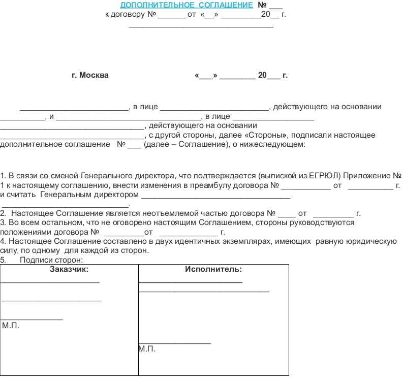 В конце контракта, как и в контракте, записываются реквизиты участников и ставятся их подписи. Если нотариус заверял главной контракт, то также нужно заверить и добавочный контракт. Аналогичная ситуация с государственной регистрацией. Добавочный договор регистрируют, когда появляется нужда в том, чтобы скорректировать раньше обсужденные участниками условия. В ситуации с трудовым договором это, например, пункты о размере платы за труд, месте труда, правах и обязательствах сотрудника и так далее. Согласно общему правилу, чтобы внести коррекции в рабочий контракт, на это обязаны согласиться и сотрудник, и наниматель (ст. 72 ТК РФ). В данной ситуации добавочный договор к договору возможно зарегистрировать в какое-либо время. Время внесения дополнений по взаимному желанию законодательно не прописано. Когда сотрудник на дополнение обстоятельств не соглашался, существует процедура для коррекций нанимателей односторонне. С этой целью обязаны исполняться некоторые обстоятельства, например, работнику нужно сообщить о дополнениях и их причинах не меньше, нежели за два месяца (ст. 74 ТК РФ).Когда сотрудник соглашается действовать в новых обстоятельствах, подписывается добавочный контракт.