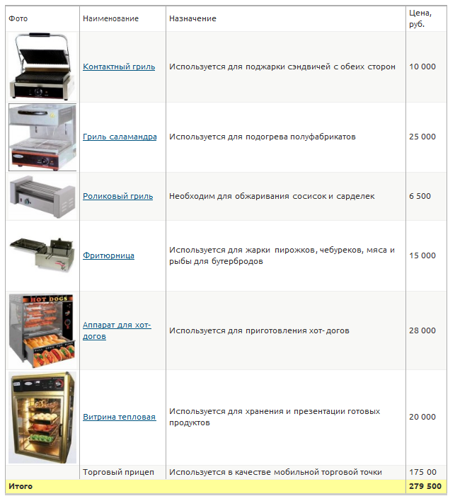 Оттого, что данная идея бизнеса касается открытия уличного кафе фаст-фуда, помещения для бутербродной не потребуется. А вот все оборудование, а также нанятый персонал, будут располагаться в специальном перевозном ларьке.