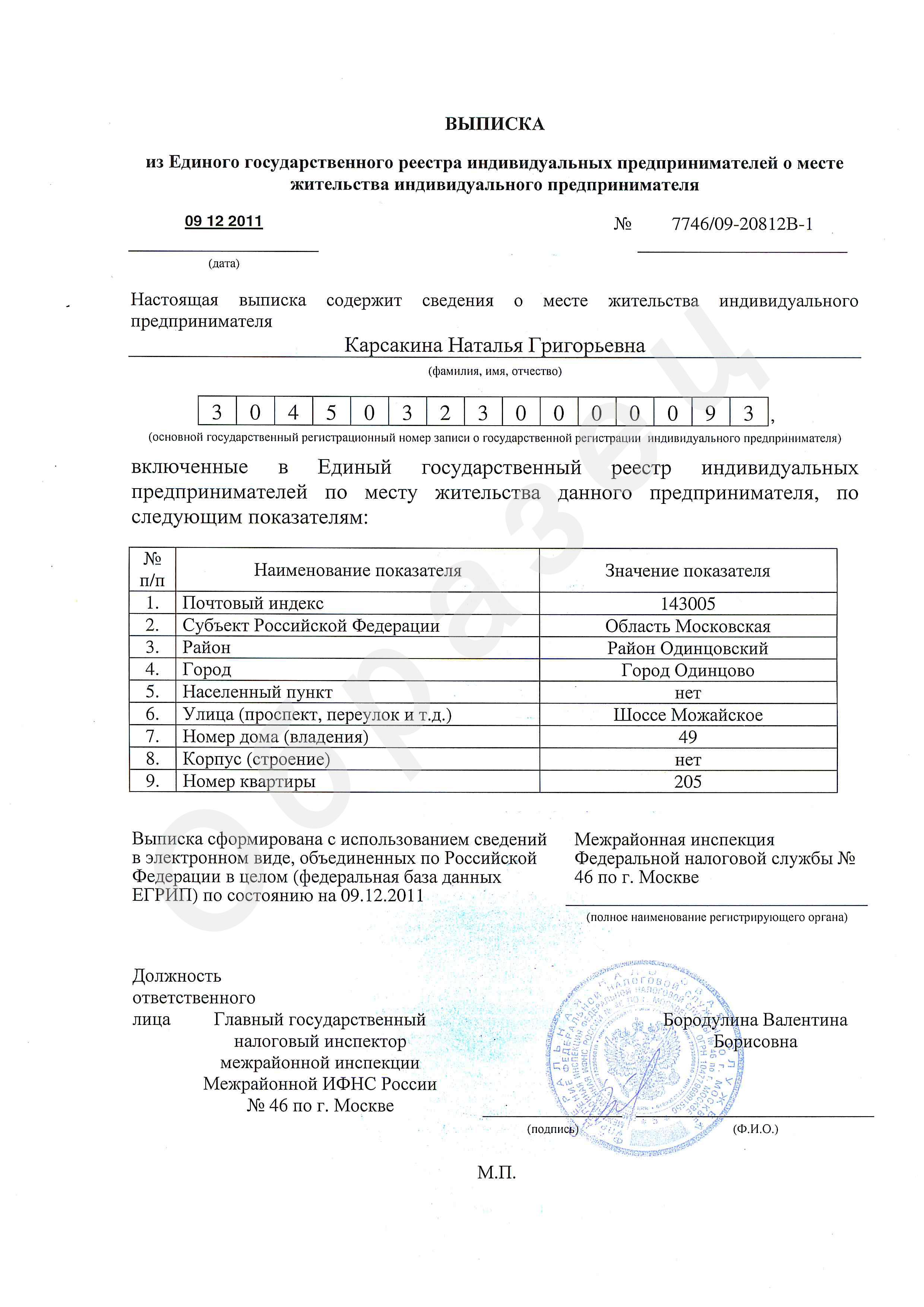 Выписка о регистрации ИП выдается ФНС и отображает: