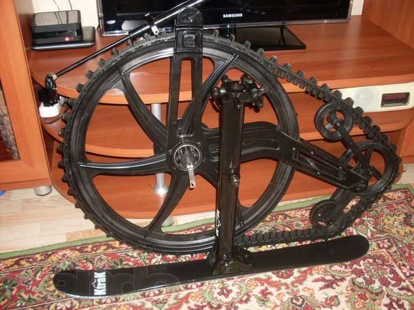Такую интересную конструкцию придумала и ввела в эксплуатацию фирма Ktrak. В состав зимнего велосипеда входит лыжа, она устанавливается вместо колеса под рулем, и задний привод, который имеет довольно сложную конструкцию, состоящую из гусеничного привода. Все это можно поставить на остов велосипеда без специальных инструментов, колеса крепятся с помощью эксцентрикового зажима. Для комфортной езды, производитель сделал в конструкции газо-масляный амортизатор. Система для езды по снегу этой фирмы подходит под каждый горный или дорожный велосипед.