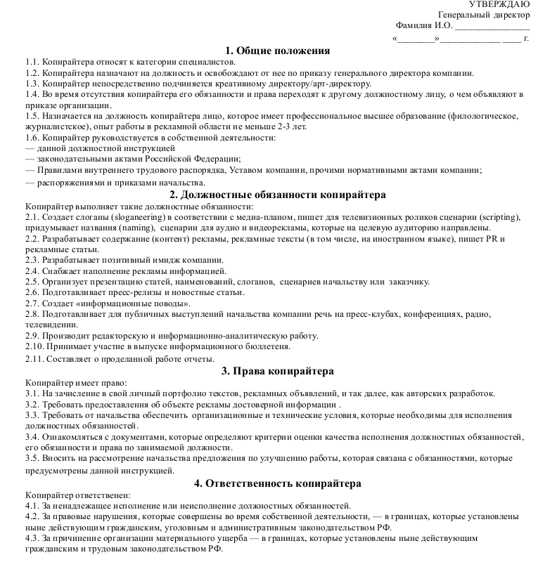 Образец должностной инструкции копирайтера