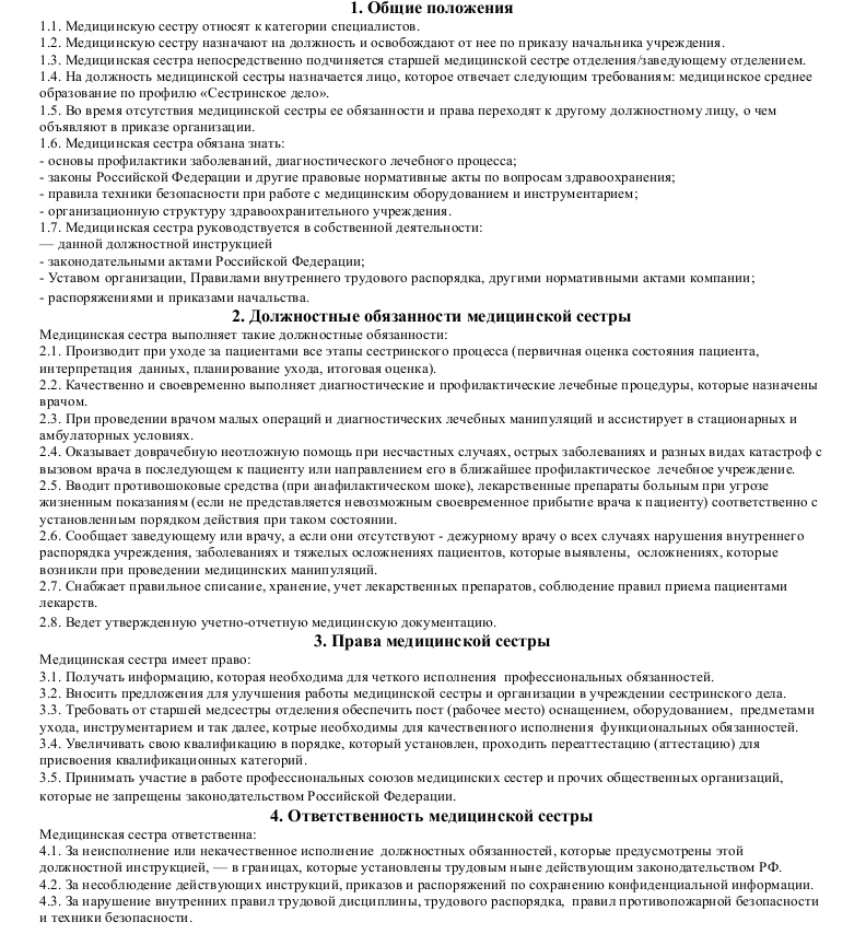 Образец должностной инструкции медицинской сестры