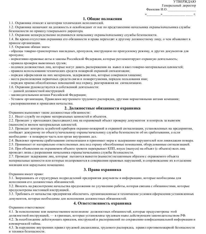 Должностные обязанности охранника в первую очередь, зависят, от того, какой объект именно ему необходимо охранять. Охрана частного лица, работа на ювелирном заводе, в офисе, в магазине, — диктуют определенные технологию и режим работы. Представленный образец должностной инструкции охранника подойдет лучше всего для «офисного» сотрудника охранной службы.