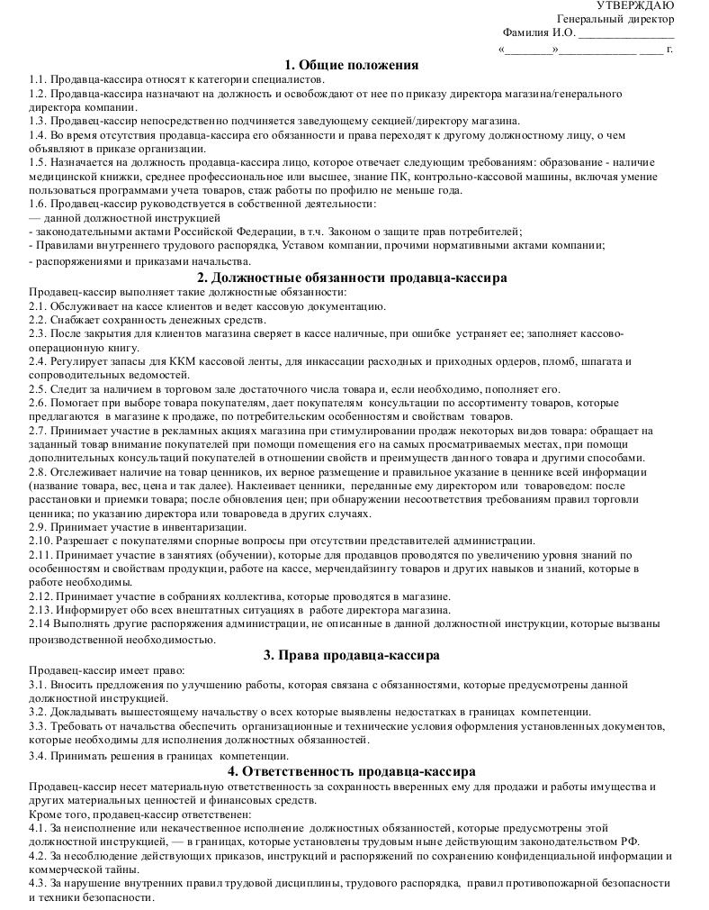 Скачать образец должностной инструкции продавца-кассира (doc, 20 КБ)