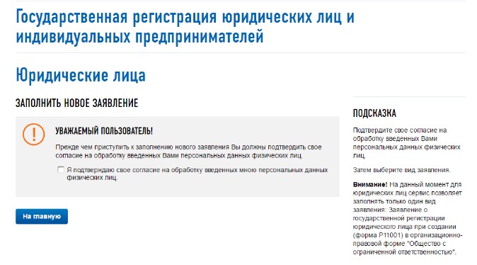 Сервис налоговой службы позволяет самостоятельно составить заявление на регистрацию ООО онлайн по форме Р11001. Его оформление не требует наличия электронной подписи, достаточно будет простой авторизации посредством почтового адреса. Важно обратить внимание на специфику сервиса – он не позволяет ввести адрес регистрации с усложненными реквизитами, в связи с этим может быть выдан отказ.