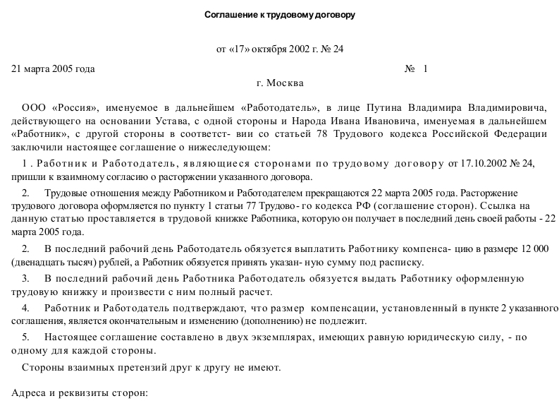 Когда сотруднику и нанимателю нужно значительно скорректировать определённый аспект их совместного влияния, то они обязаны создать добавочный контракт к уже имеющемуся рабочему контракту. При этом немаловажно осознавать, что уже подтверждённый и расписанный обеими сторонами контракт нельзя скорректировать. Важно при труде правильным образом нумеровать бумаги и сберегать их в спецжурнале.