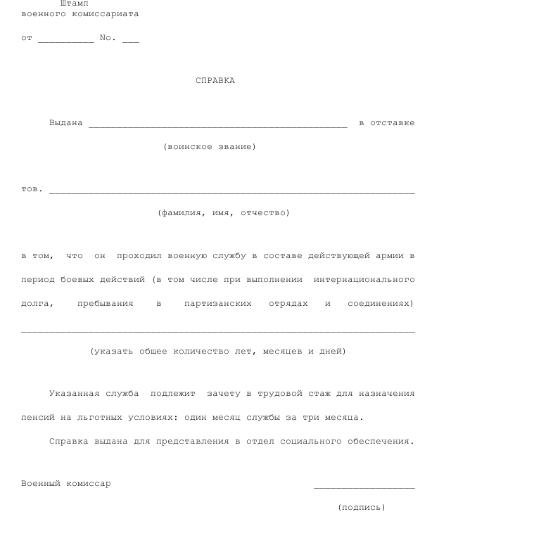 Образец справки о периоде военной службы в составе действующей армии