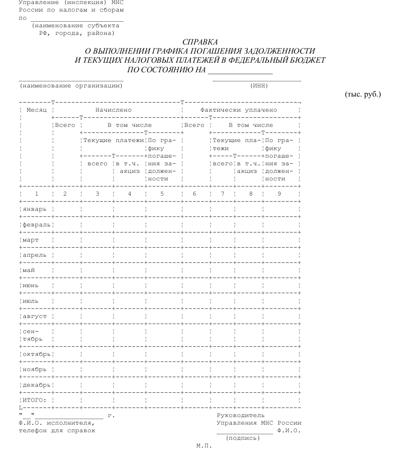 Образец справки о выполнении графика погашения задолженности и текущих налоговых платежей в федеральный бюджет