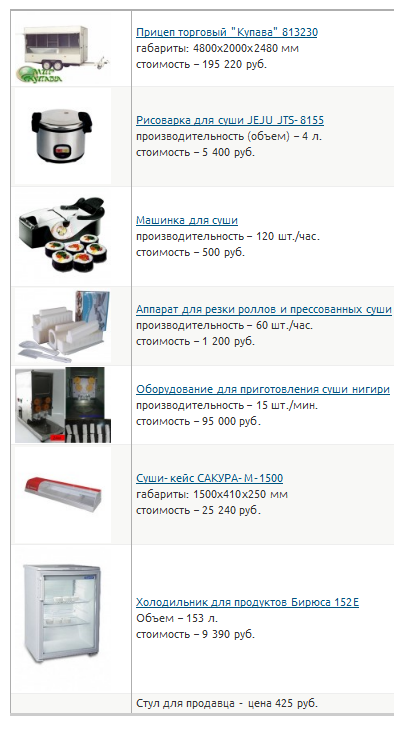 Общие затраты на покупку оборудования для такого мобильного суши-бара составляют – 332375 рублей.