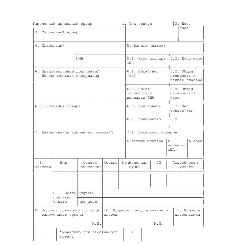 Документ отвечающий за таможенный ордер это бумага строгого оформления и должна быть заполнена таможенным работником в трех копиях. Первый документ остается в таможне, где и были утверждены все необходимые по закону проплаты, вторая копия согласно строгому контролю должна находится в бухгалтерии, а судьба третьей копии быть отданной гражданскому лицу осуществляющему платеж.