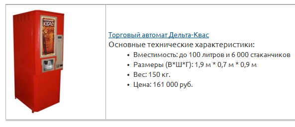 Альтернативный вариант – торговый квасной автомат. Помимо выше представленных вариантов, для организации подобного квасного дела, следует приобрести вендинг-аппарат, позволяющий осуществлять круглосуточную деятельность и не привлекать реализаторов. Пример такого оборудования может быть автомат для продажи кваса «Дельта-Квас».