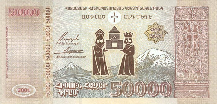 Банкнота достоинством 50000 драмов была выпущена 6 июня 2001 года в ознаменование 1700-летия принятия, как государственной религии Армении, христианства.