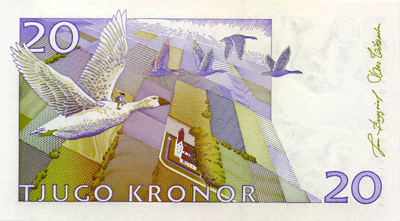 - 20 крон с изображением писательницы Лагерлёф Сельмы на лицевой стороне и Нильсом (героем её сказки «Чудесное путешествие Нильса с дикими гусями») — — на обратной стороне;