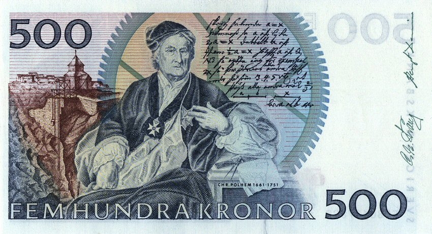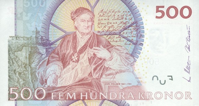 - 500 крон с изображением короля Карла XI и шведского промышленника и изобретателя Полхема Кристофера;