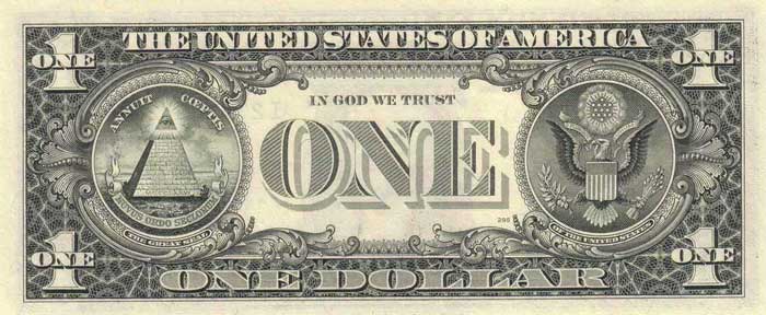 На обратной стороне однодолларовой банкноты помещены два изображения Большой двухсторонней печати США. Именно к большой печати (а не к дизайну непосредственно банкноты) относятся все самые часто обсуждаемые элементы: оливковая ветвь с 13 кисточками, 13 полос на щите орла, и 13 стрел в его лапах, 13 ступеней в усеченной пирамиде, 13 звезд в облаке над головой орла (первоначально в США вошло 13 штатов), римские цифры MDCCLXXVI обозначают число 1776 (год провозглашения Декларации независимости), отрезанная верхушка пирамиды с вписанным глазом («Всевидящее око», очень древний религиозный символ), латинские надписи «Е pluribus unum» (всего 13 букв, «Из многих — единое»), «Annuit Cœptis» (13 букв если считать букву œ за две, «Он одобряет наши деяния») и «Novus Ordo Seclorum» («Порядок нового века») — цитаты заимствованные из «Энеиды» Вергилия и символизирующие наступление «американской эры». Хотя обыкновенно все эти элементы связывают с масонством.