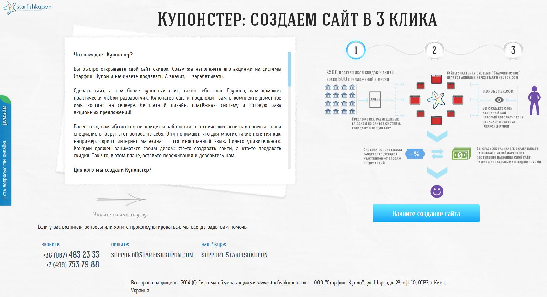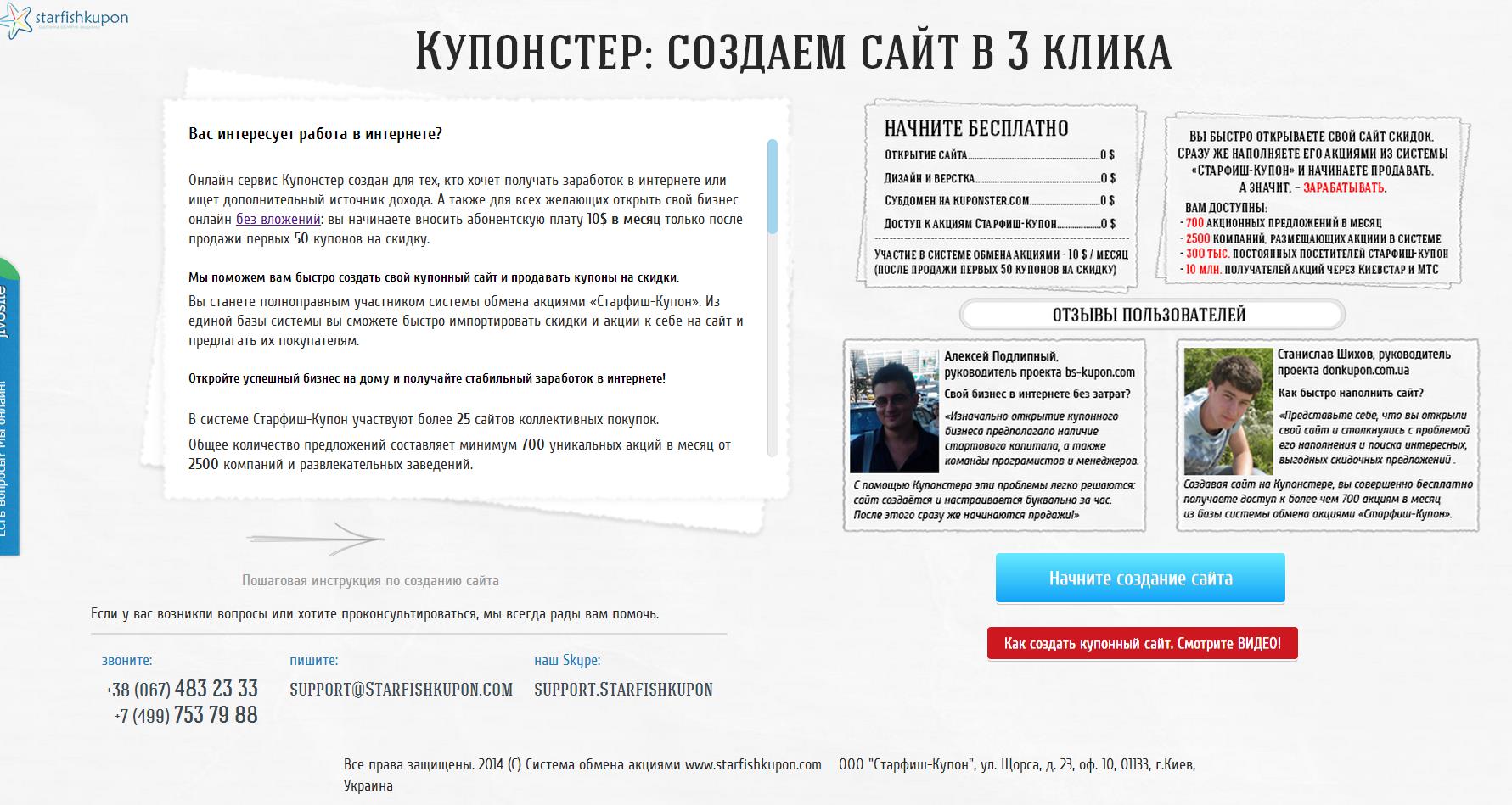 Мы создали систему Starfishkupon.com. Цель этой системы – помочь выжить небольшим компаниям, которые уже есть на рынке и снизить «порог входа» в бизнес для каждого желающего новичка, чтобы он мог попробовать запустить свой интернет-бизнес и начать зарабатывать «свободные» от работодателя средства.