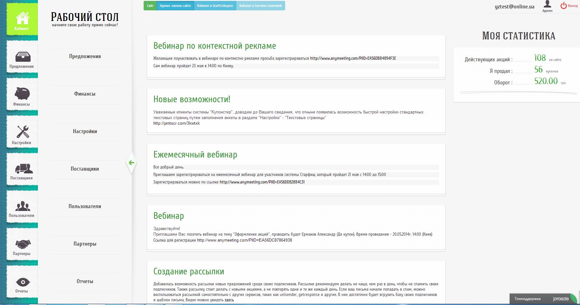 В системе реализованы все необходимые инструменты для работы: возможность оформления акций с добавлением изображений и видео, возможность продавать купоны с помощью всех платежных шлюзов интеркассы и робокассы, возможность рассылки предложений по своей базе подписчиков, возможность добавления счетчиков метрики для анализа, возможность проверки кодов купонов, возможность разместить свою акцию на агрегаторах с помощью xml-выгрузки. В ближайшем будущем, появиться возможность добавления баннеров и продажи баннерных мест у себя на сайте и другие инструменты, которые запрашивают наши пользователи.