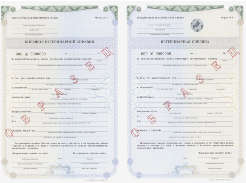 Документ ветеринарной справки при перевозке грузов в пределах района (города) по форме №4 оформляет ветеринарный врач. Если продукт вывозится на экспорт, выдаются заполненные бланки с номерами 1-4 установленного образца. При необходимости их окрашивают и ставят орнамент с обратной стороны.