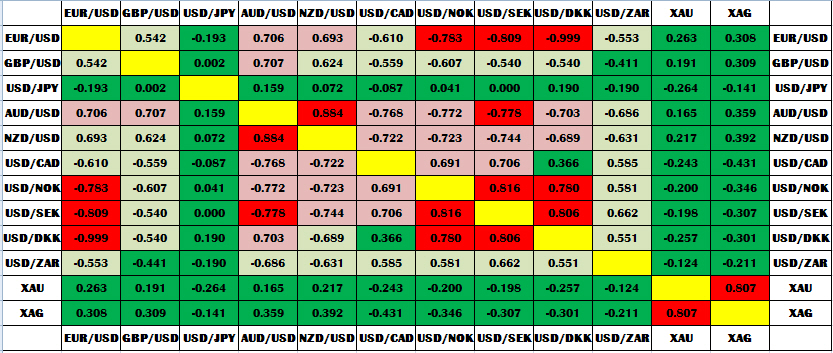 Вот таблица корреляции валютных пар, можно увидеть какие изменения могут иметь те или иные пары относительно друг друга: