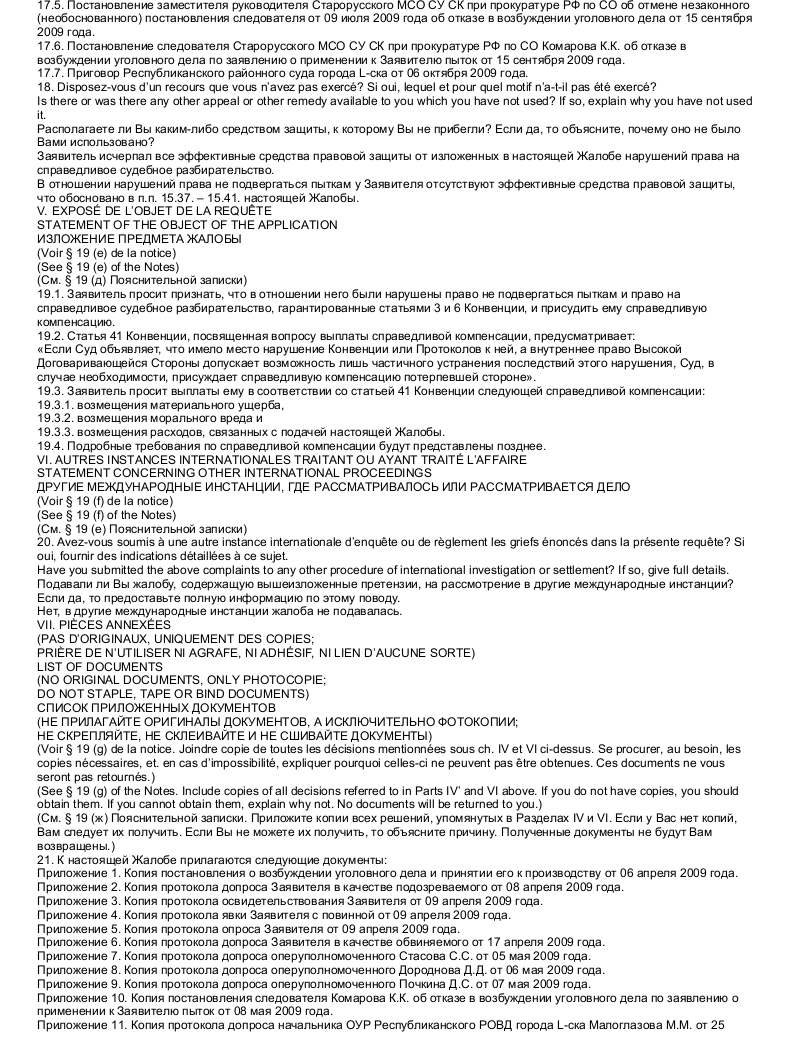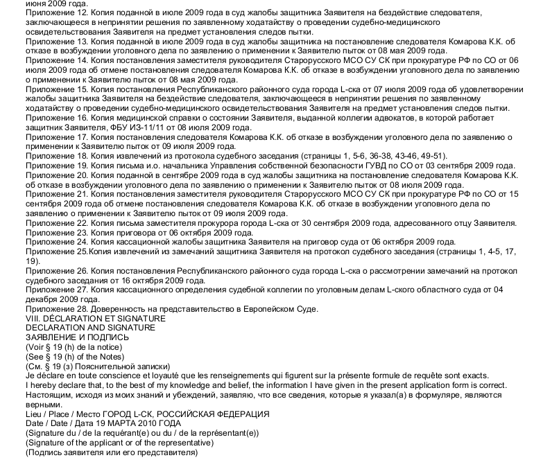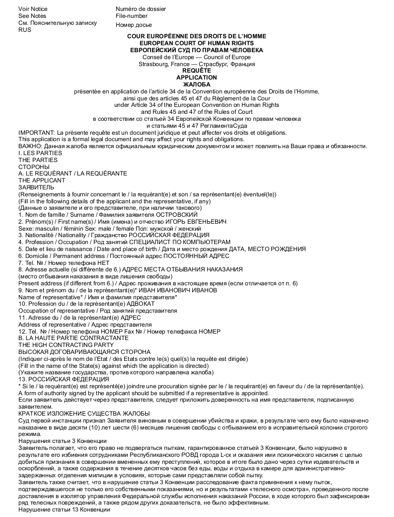 Образец жалобы в Европейский Суд по правам человека