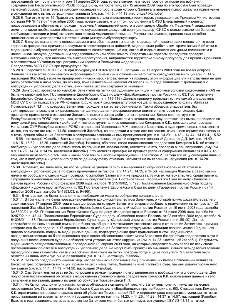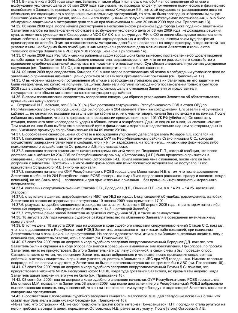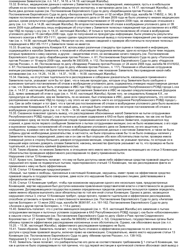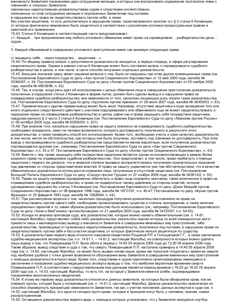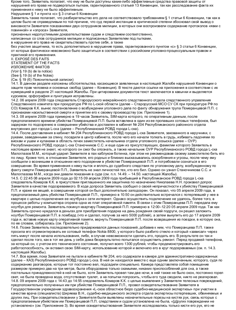 Пожалуйста, обратите внимание, что размещенный ниже образец жалоб в Европейский Суд по правам человека призван только продемонстрировать подход к оформлению жалоб в целом. Подготовить на их основании жалобу в Европейский Суд по правам человека не представляется возможным, так как каждая качественная жалоба в Европейский Суд по правам человека является индивидуальной, если не считать некоторых исключений из этого правила, так как подобного рода жалобами (вроде жалоб на чрезмерную продолжительность судебного разбирательства или продолжительное неисполнение судебных актов, вступивших в законную силу, жалоб только на условия содержания под стражей и т.п.) занимаются специальные органы.
